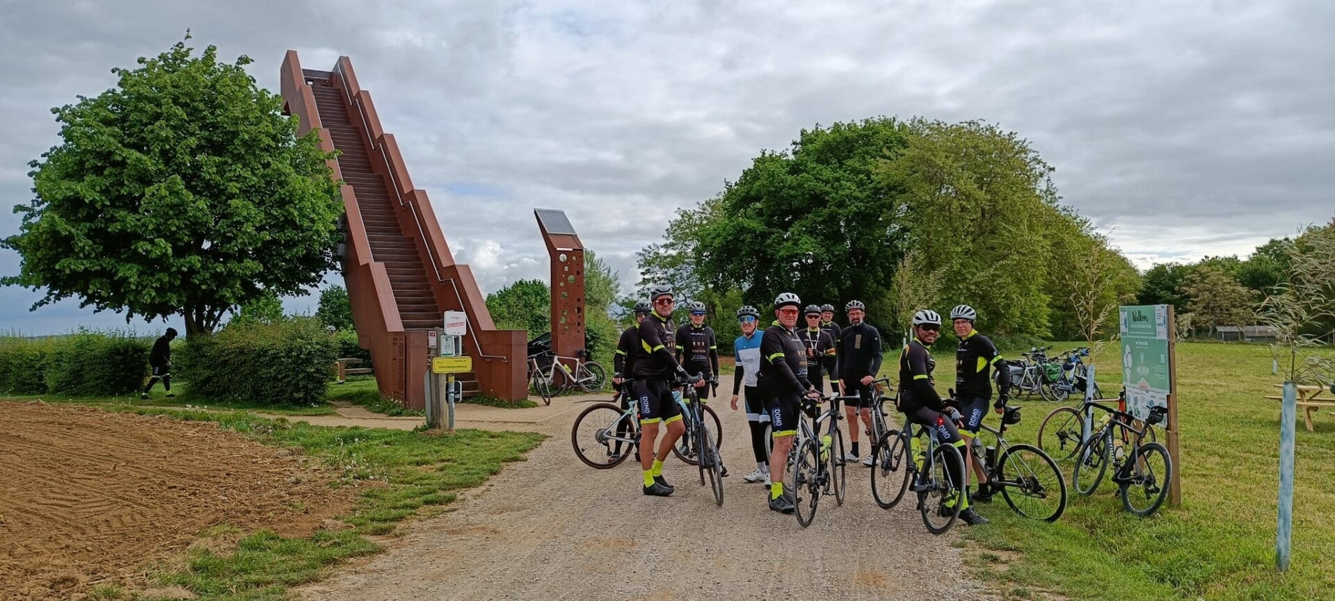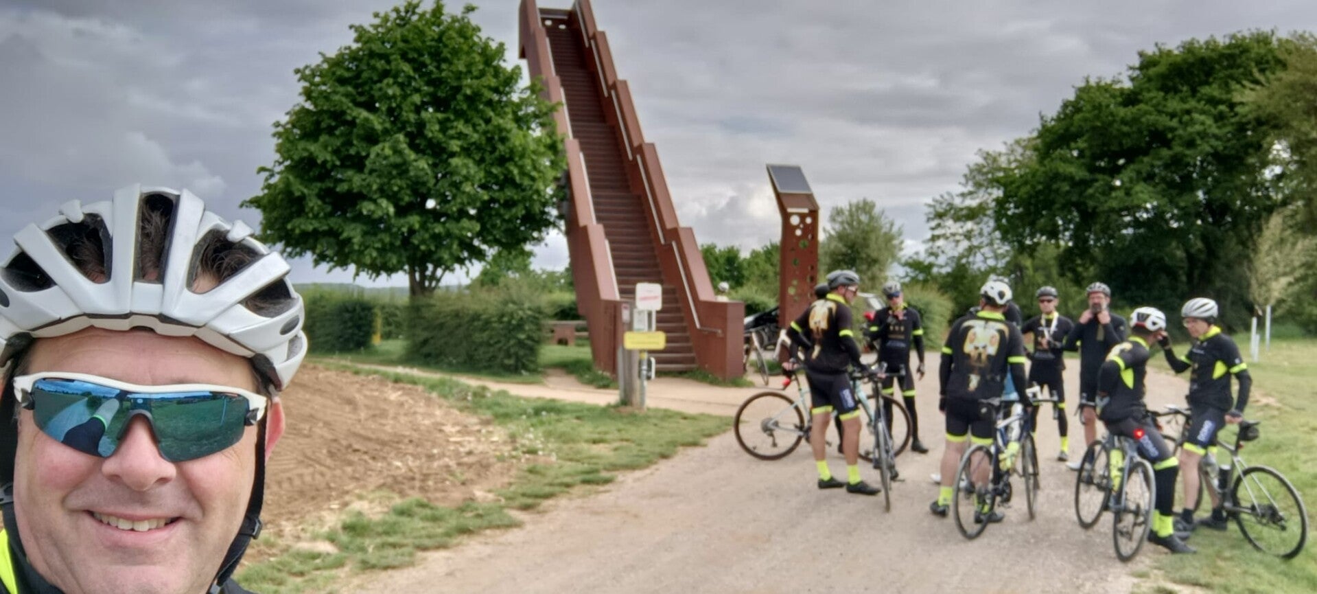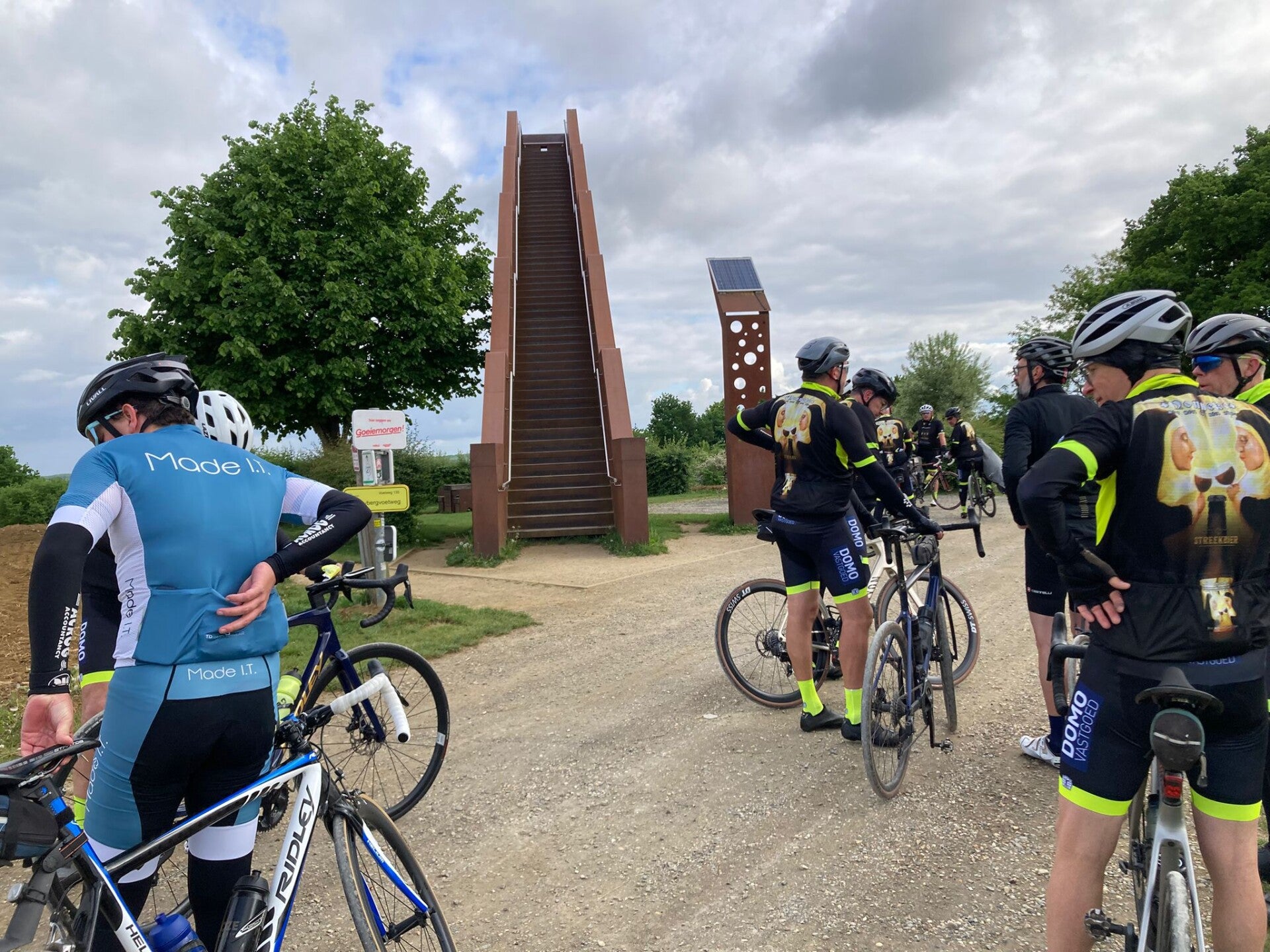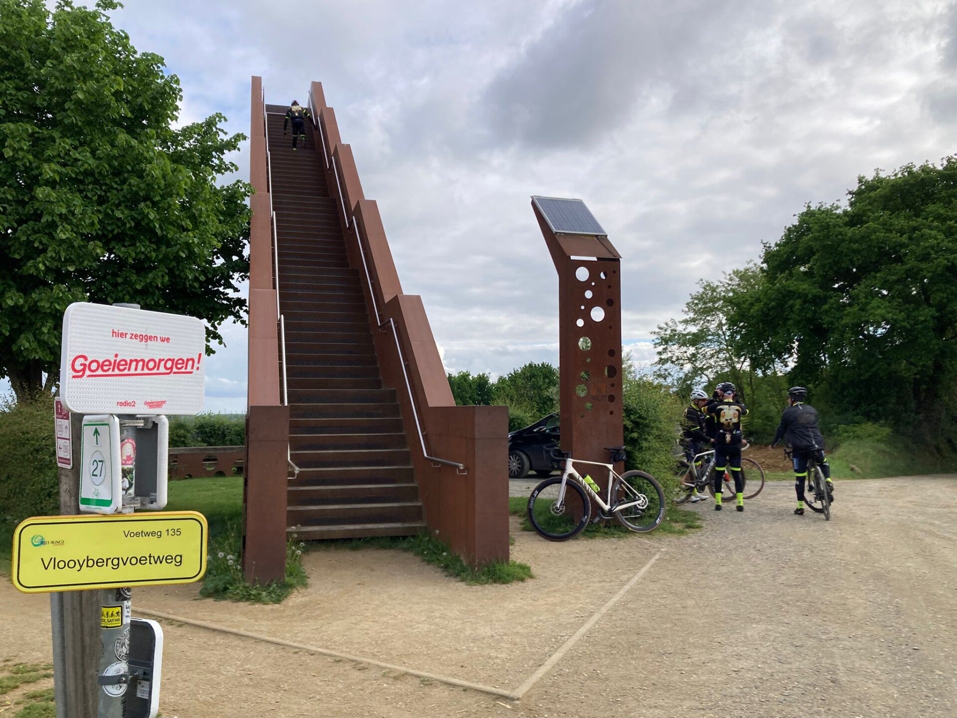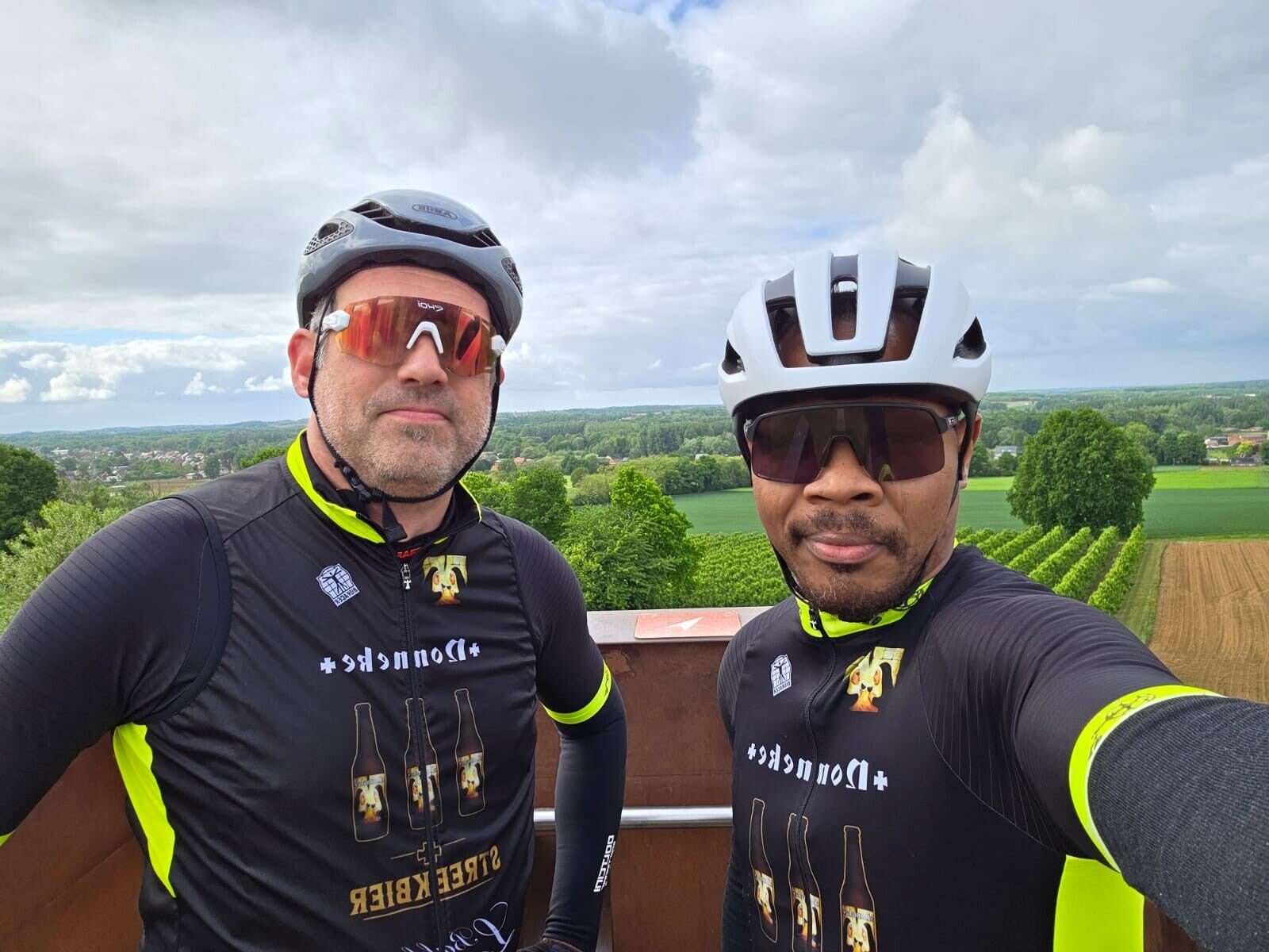 Voor onze Ronny kwam die hemelse interventie helaas net iets te laat. Net voor de vlooybergtoren reed hij lek. Alsof de Vlooybergtoren dacht: 'Ho, stop! Eerst even genieten van het uitzicht!' Na een korte, pauze met panoramisch uitzicht, zetten we koers naar Scherpenheuvel.