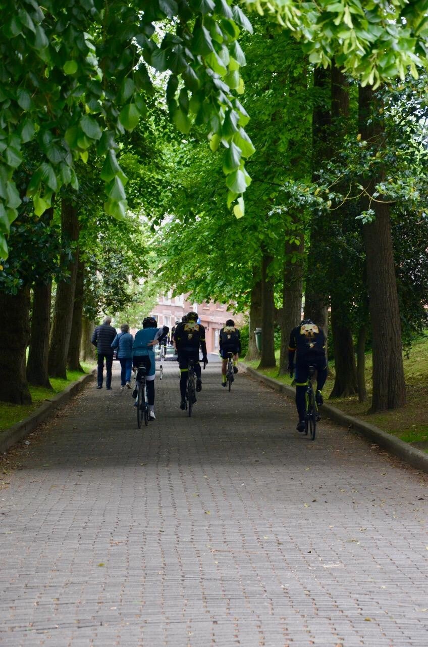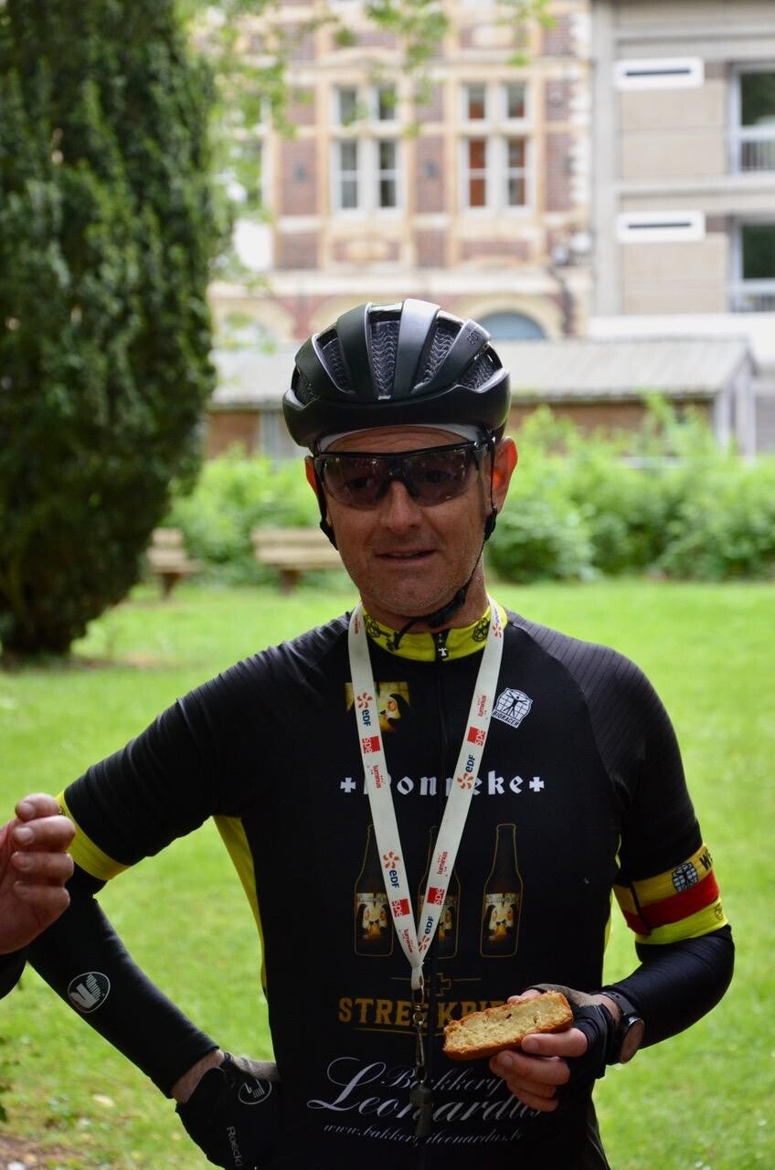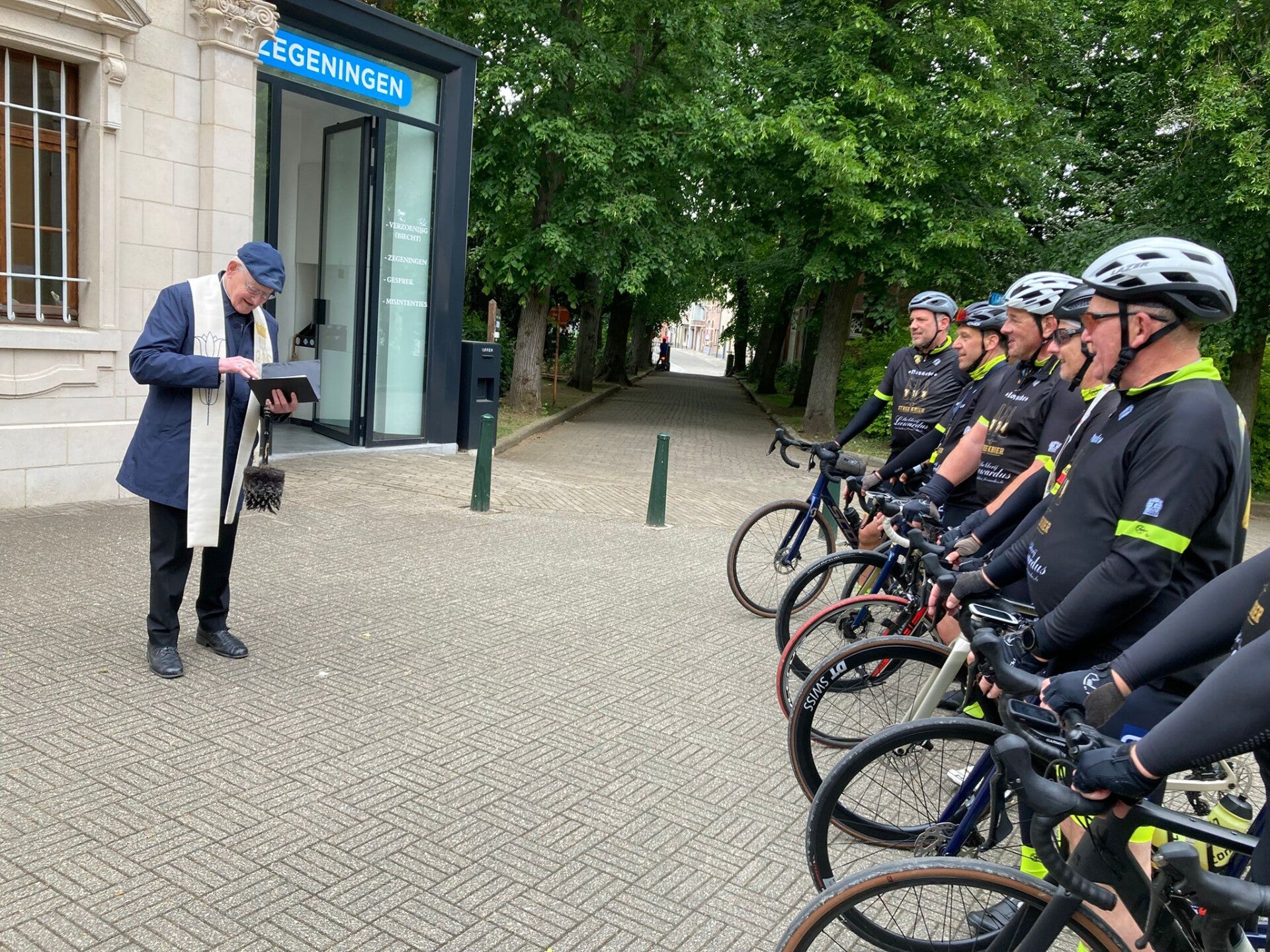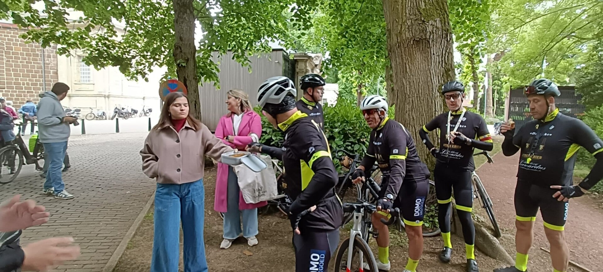 Vervolgens was het moment suprême: de zegening van onze fietsen. Hopelijk zijn ze nu bestand tegen alle mogelijke pech, van verdwaalde punaises tot jaloerse stoeptegels. Na deze spirituele boost verwende Ann, Lorelei en Brent ons met een welverdiende, overheerlijke cake. Ann, Lorelei en Brent, jullie zijn de helden van de dag!