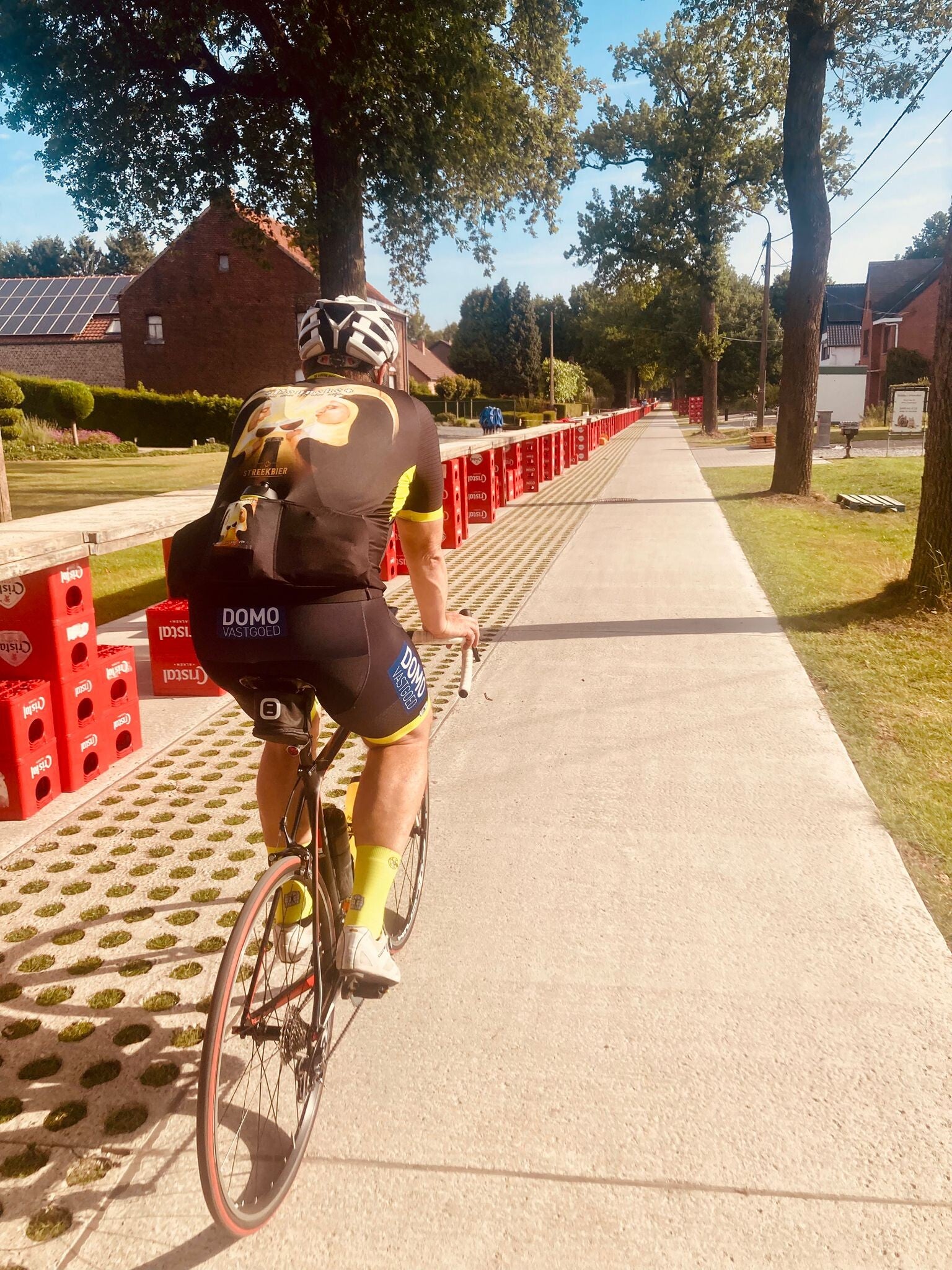 De rit zelf verliep vlot. In de zon was het heerlijk warm, in de bossen dan weer wat koeler een perfecte afwisseling. In Zutendaal, langs de Asserweg, passeerden we de plek waar een dag eerder het wereldrecord ‘langste toog’ werd verbroken. Maar liefst 1.550 meter en 90 centimeter aan toog, proficiat aan alle deelnemers!