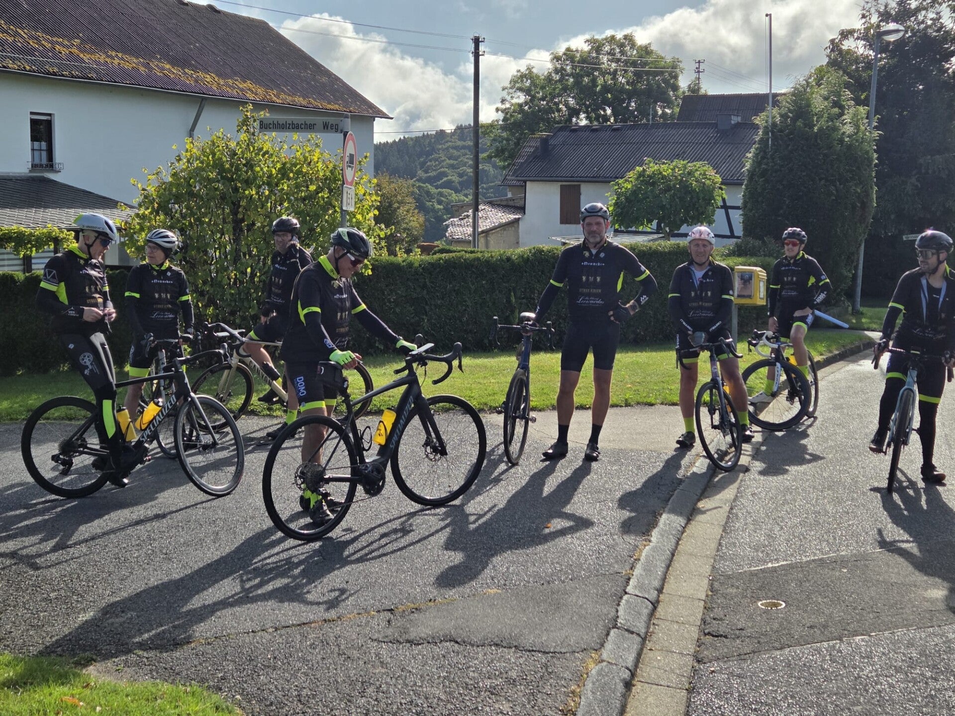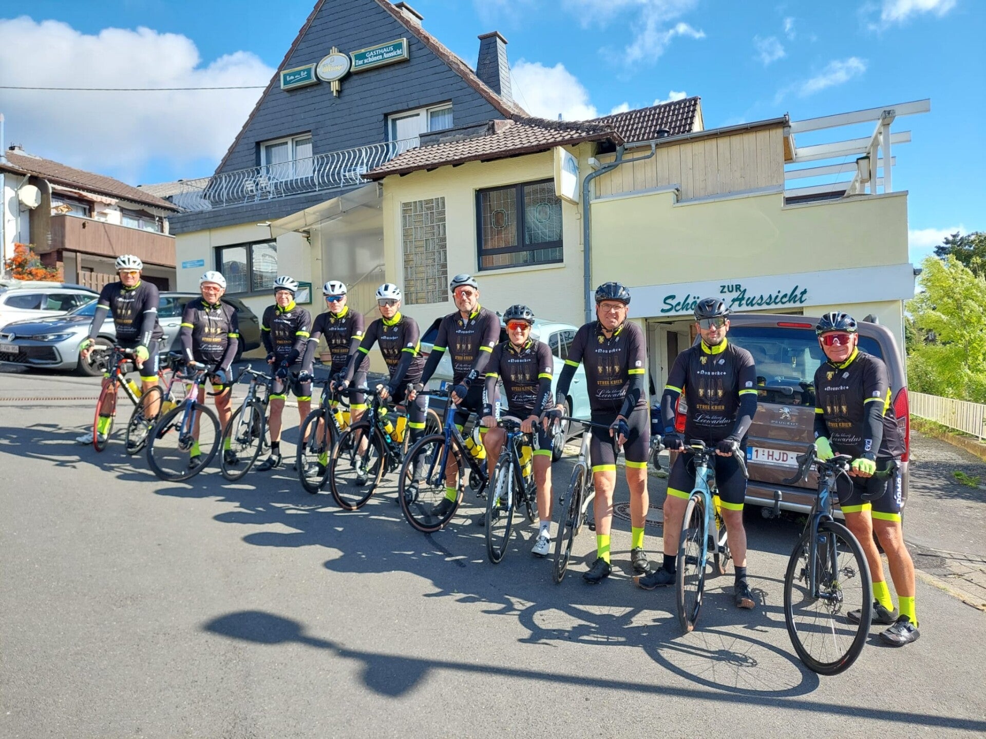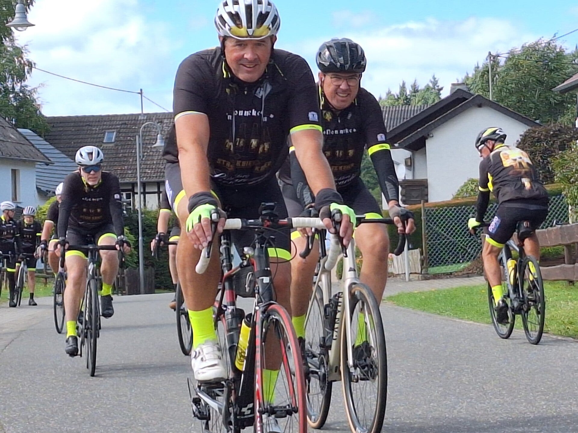 Vrijdagmorgen vertrokken we vroeg voor ons langverwachte fietsweekend. Na een kleine twee uur rijden kwamen we aan bij het huisje. Even snel uitladen, iets eten, fietsen klaarmaken en dan konden we aan onze eerste rit beginnen. Yves C begon meteen te vloeken: hij was zijn gps en hartslagmeter thuis vergeten. Gelukkig had hij zijn flauwe mopjes wél bij, want anders waren we écht verloren geweest.