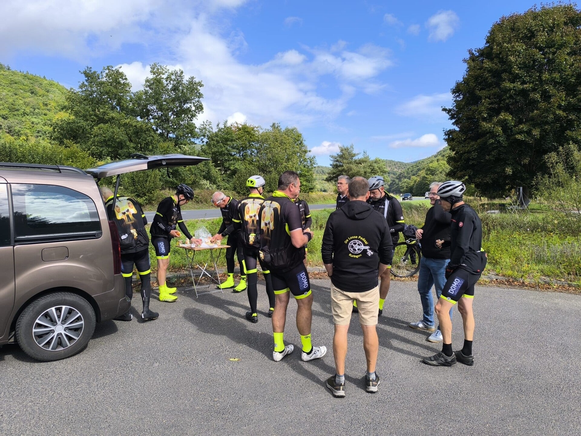 Volgens de buienradar zou het droog blijven. In het begin was het fris, maar de zon liet zich gelukkig snel zien. De benen voelden niet meer zo fris als op vrijdag, maar toch trapten we nog 54 kilometer en 930 hoogtemeters bijeen. De eerste klim ging stroef, maar daarna kwamen de benen terug tot leven. In de afdalingen namen we geen risico’s de weg lag nat van de regen van afgelopen nacht. Zo voorzichtig zelfs dat Noël zijn hoefijzers moest gebruiken om tijdig stil te vallen. Gelukkig bleef hij overeind, al zal hij nog wel even nagelbijten als hij eraan terugdenkt.