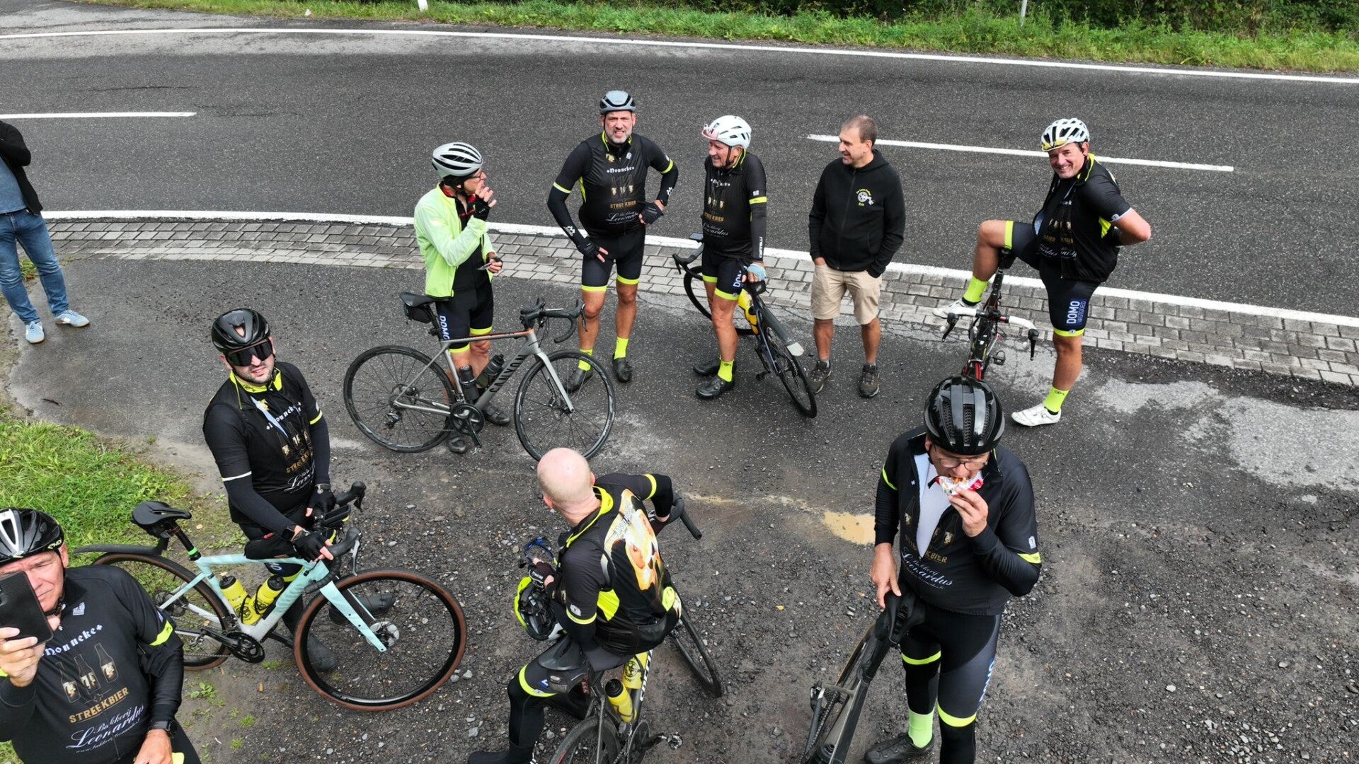 Alles verliep vlot, tot Johan zijn binnenband besloot een diepe zucht te laten. Platte band, doeme. Gelukkig was dat snel gefikst met een nieuwe binnenband en wat lucht, en konden we weer verder. Iedereen kwam veilig aan en genoot van een frisse pint, een chocomelk of iets anders.