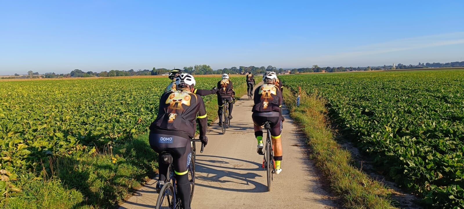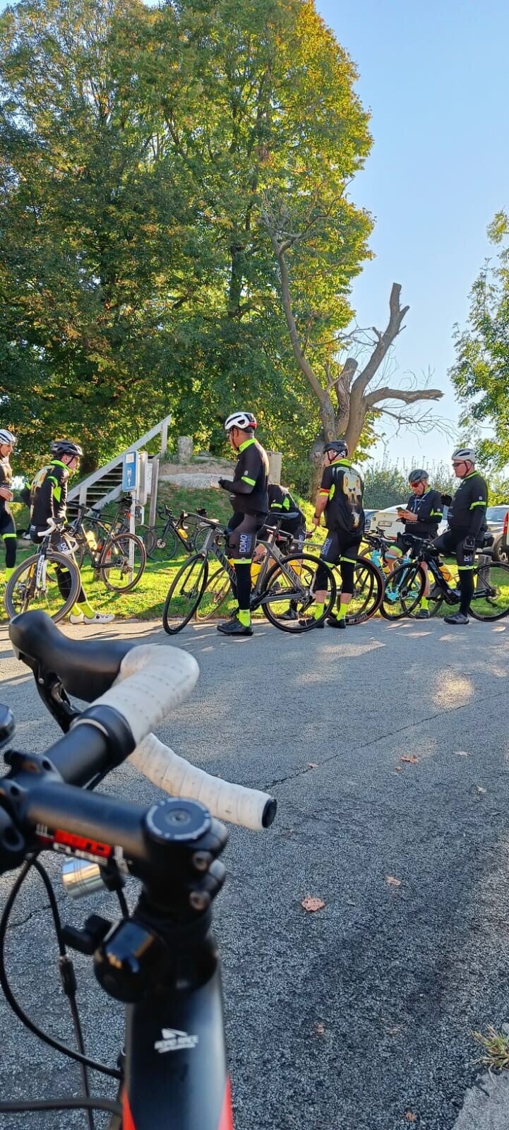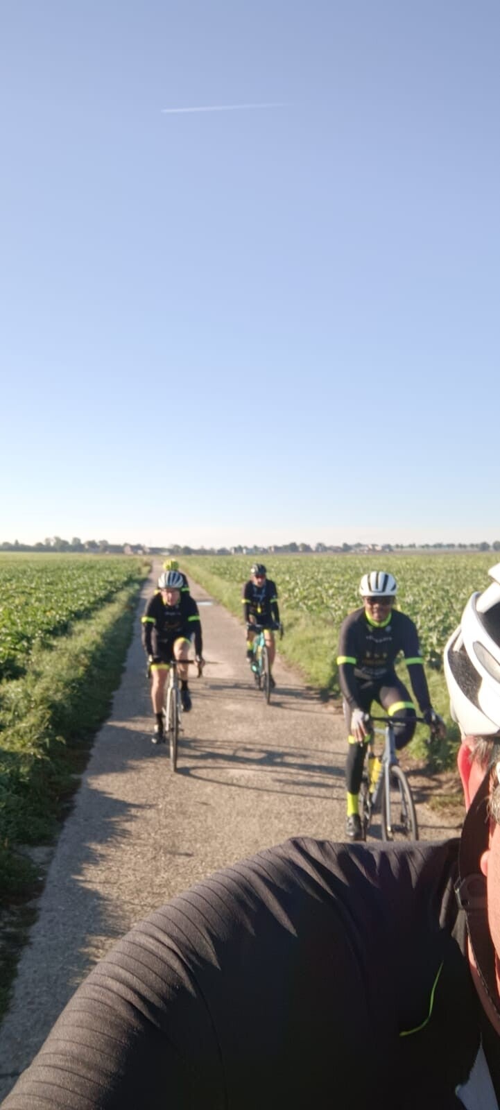 Koele,vochtige ochtend, vijf graden op de thermometer, maar een ontluikende zon warmde ons al snel op, bij de ene al wat sneller dan bij de andere... Onze birthday boy Adams had zich verslapen maar zou wat later nog wel aansluiten verzekerde hij ons. Gelukkig reed Willy in Joppenbeek al plat en na enkele minuten sukkelen om de band te wisselen zien we in de verte Adams opduiken , vol speed (allez snelheid bedoel ik🤣) om toch maar bij ons te kunnen geraken. Hij vergat te remmen zodat hij langs ons door raasde als een jachtluipaard op snelheid, maar uiteindelijk kon hij toch zijn anker uitgooien en geraakte hij stil zodat we daarna samen als 1 groep konden vertrekken.