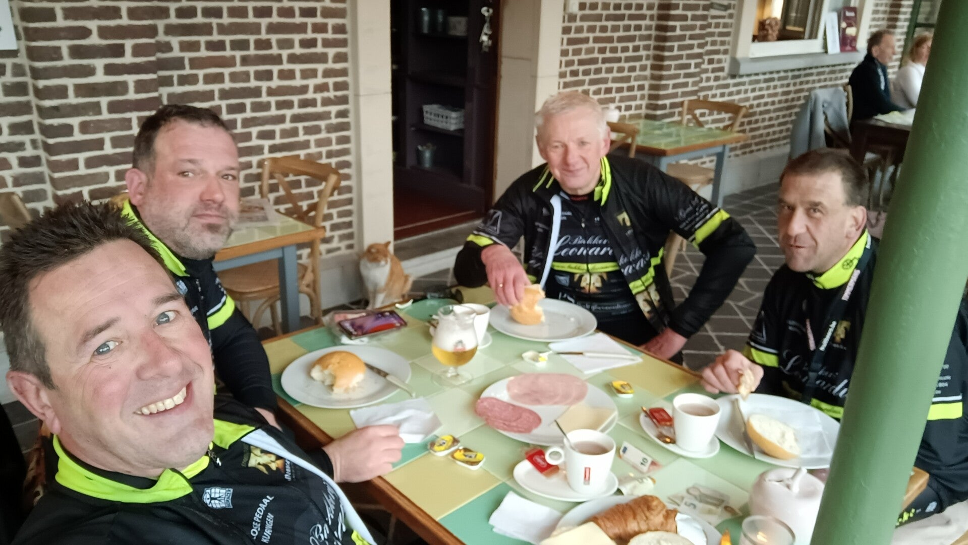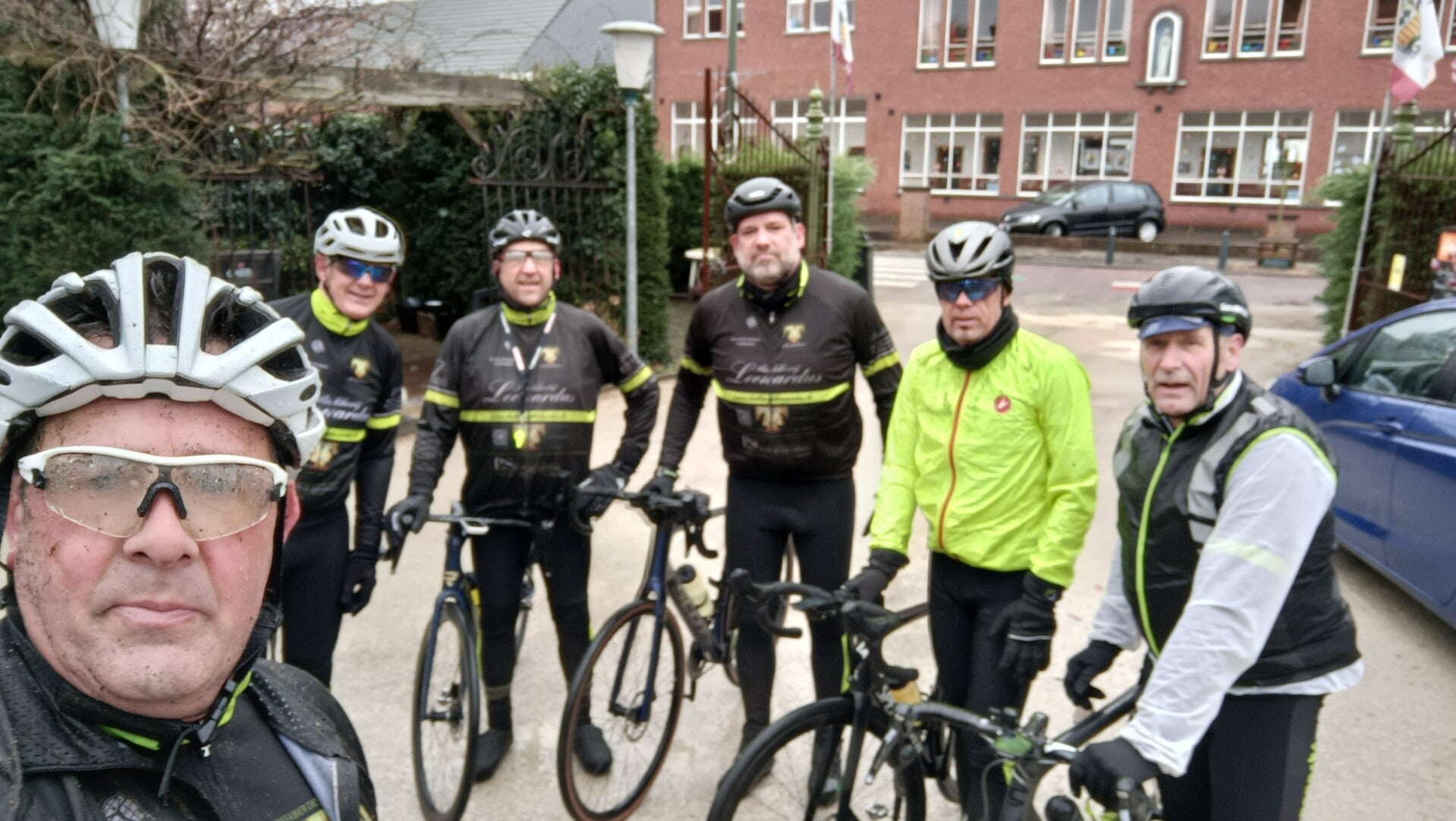 Regen, regen & regen dat is de weersvoorspelling voor vandaag. De ene annulering na de andere volgen mekaar op in onze WhatsApp groep ’s morgens maar er zijn ook een paar echte Flandriens en dus zien we inderdaad aan de start zes dappere coureurs staan. Onze twee clubkampioenen van vorig jaar en 4 bestuursleden. We gaan de geplande rit van 71 km rijden richting Laakdal. We beginnen met lichte regen langs het kanaal tot in Ham. We steken zelfs een paar kayakkers voorbij maar fietsers … af en toe eens ene maar geen enkele groep. Dat wil dus zeggen dat het eigenlijk geen weer is voor ne hond door te jagen maar we laten ons niet kennen. Het opspattend water van de voorganger maakt niet veel uit want we voelen al snel ’t water via onze helm, over onze rug en benen zo aan ons bottekes inlopen. Blijven rijden is de boodschap om ’t niet koud te krijgen en in de bochten een beetje voorzichtiger om geen slippertjes te maken. Vanaf de oversteek in Ham gaan we via Tessenderlo onder Laakdal door. Klaart het daar precies wat op? Nee, toch niet, valse hoop. In de regen door Gerhagen en dan maar snel via Engsbergen naar de Zwarte Beek. Genieten? Tja, straks misschien, als we binnen zitten met ne warme choco en ne Duvel. Via Tiewinkel gaan we naar de gekende laatste brug richting Stokrooie waar blijkt dat er toch een paar mannen nog een extra cartouche hadden om aan de brug op te vliegen. Fijn om te zien maar er zijn er ook blij dat we er bijna zijn. Aan ’t Goed Leven willen we eigenlijk zo snel mogelijk binnen maar die 1 minuut langer in de regen voor ne foto kan er ook nog wel bij. Helemaal opdrogen binnen is onmogelijk maar wat opwarmen en ons opkikkeren met een drankske en ne pistolet dat maakt alles goed ! En mannen ervan genoten? Tja, eigenlijk toch wel hahaha …