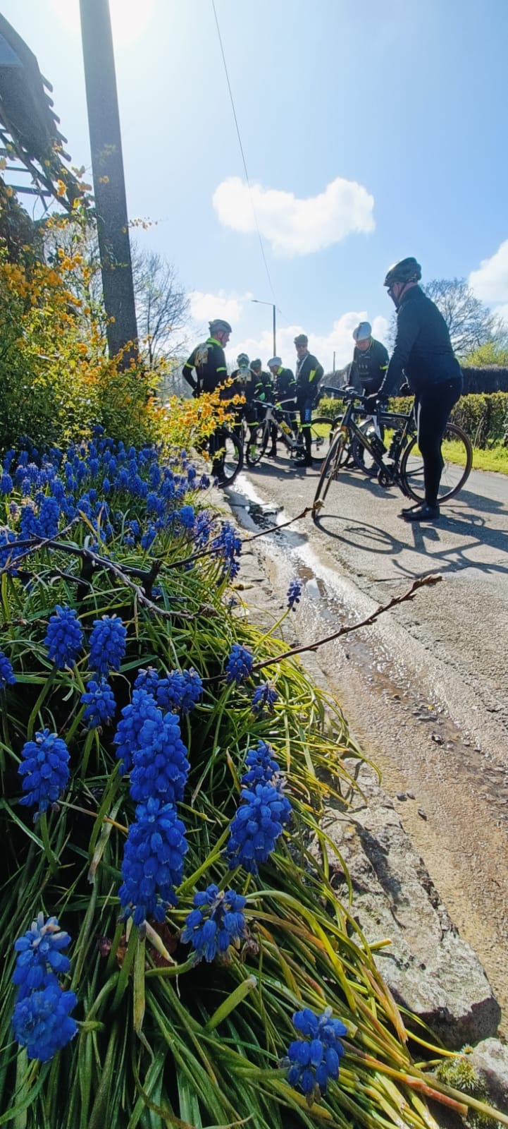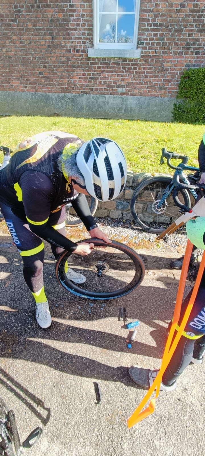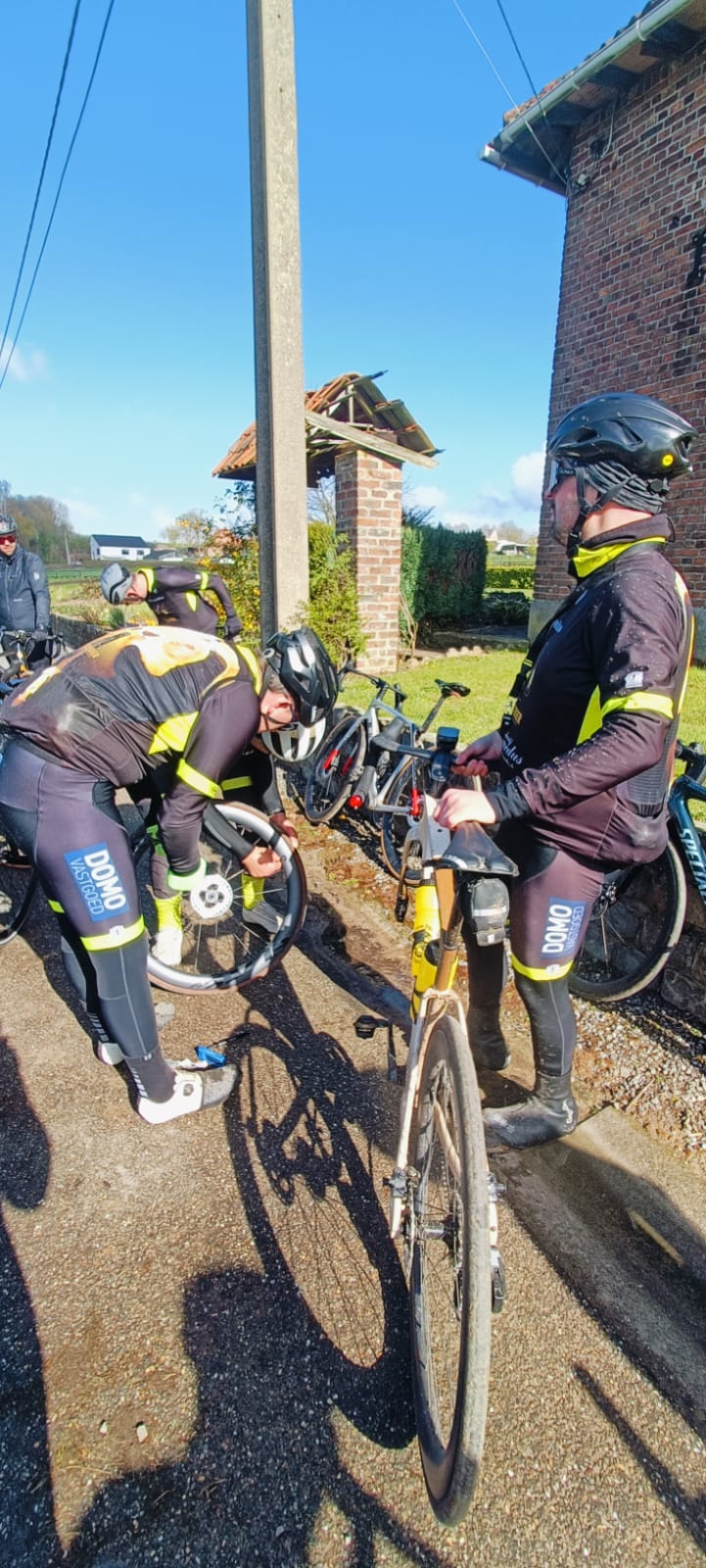 Daarna konden we eindelijk genieten van het zonnetje en de mooie wegen. Maar op een goeie 20 km van het einde kreeg ook Willy prijs. Zijn band gaf er de brui aan… en misschien speelde de angst voor de “Gouden Sepap” op het einde van het seizoen toch al wat mee 😅 Inhaalmanoeuvre ingezet!