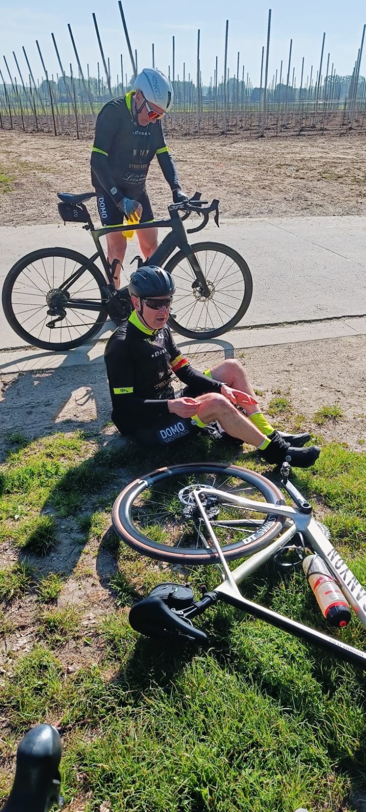 Het was niet alleen fris, maar ook… los 😄 Kris deed de naam “De Losse Pedaal” alle eer aan. Nog maar net vertrokken en we mochten al stoppen: pedaal los. Gelukkig snel opgelost met de juiste inbus en hup, weer verder alsof er niets gebeurd was 🔧