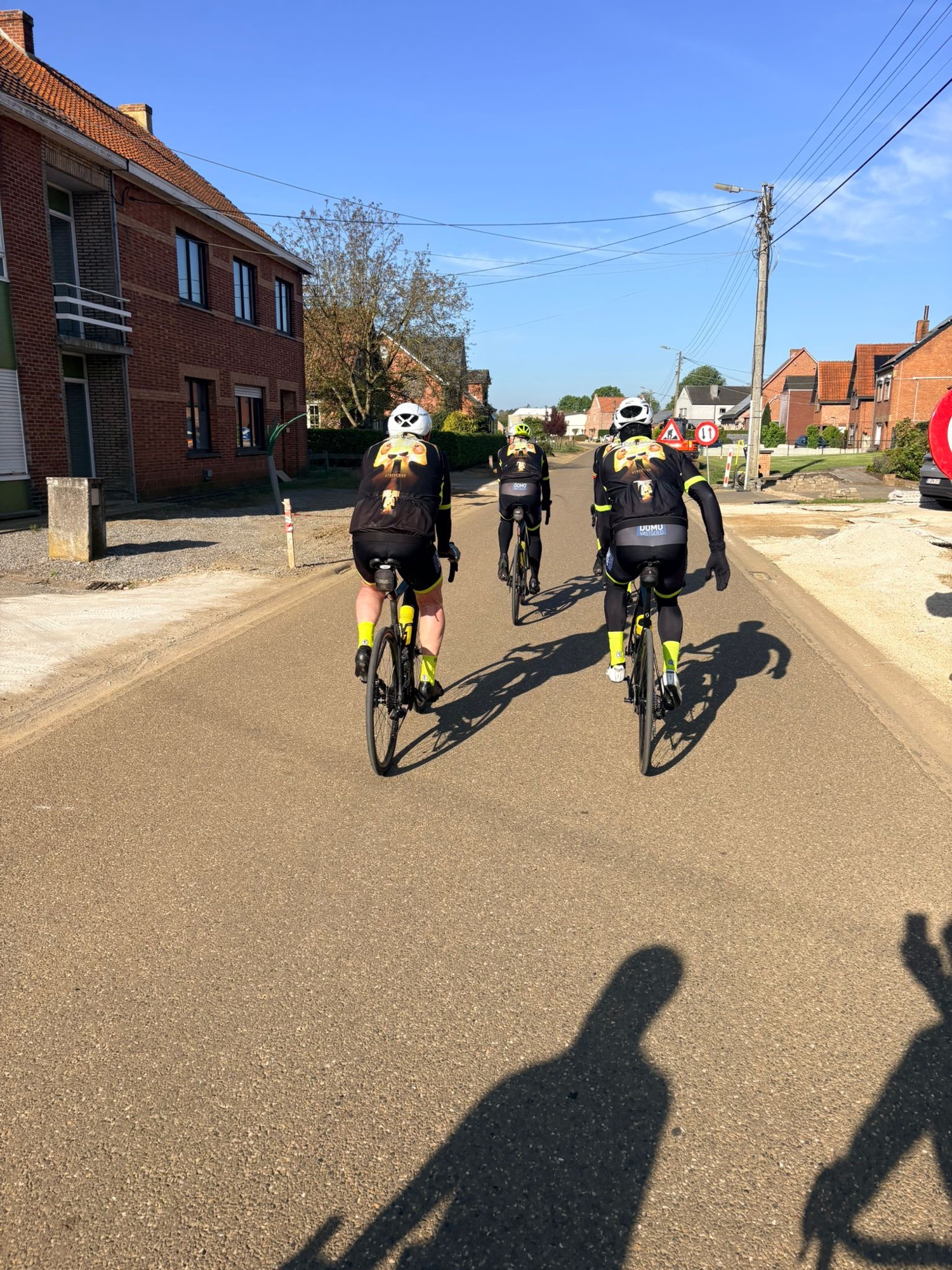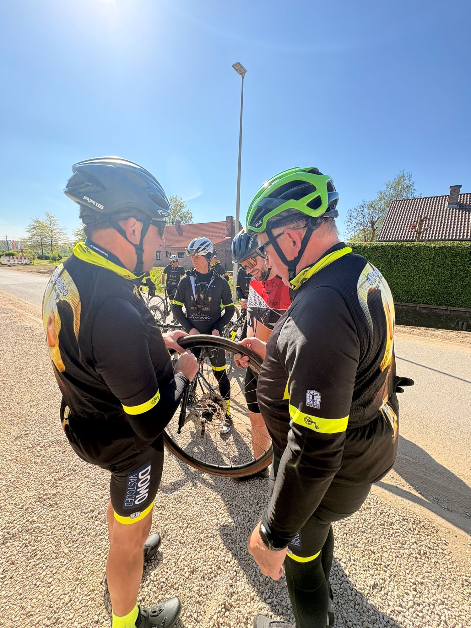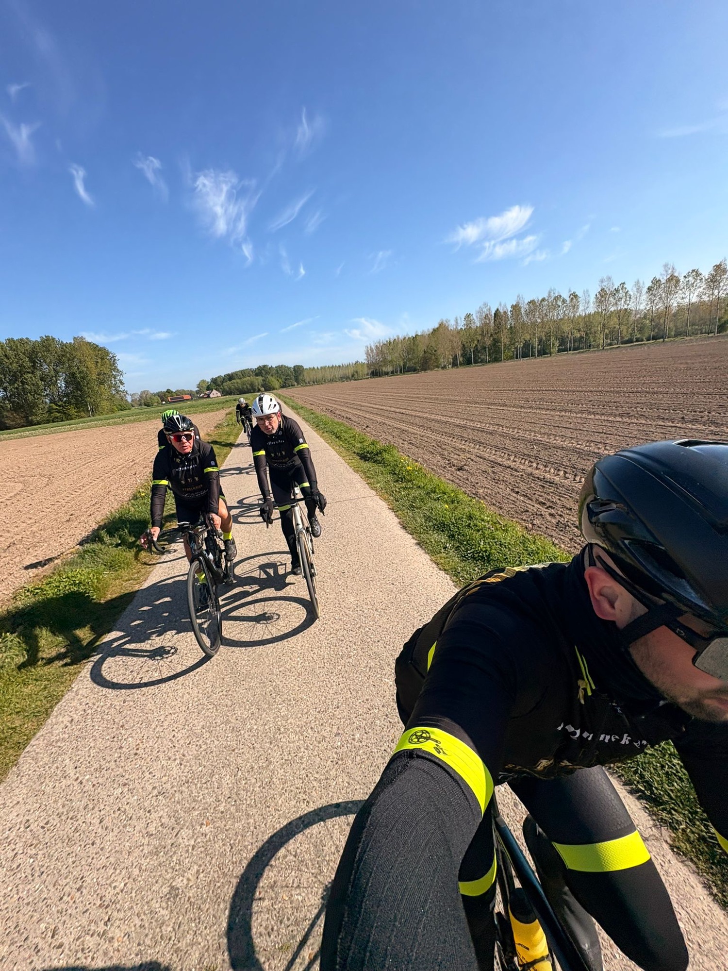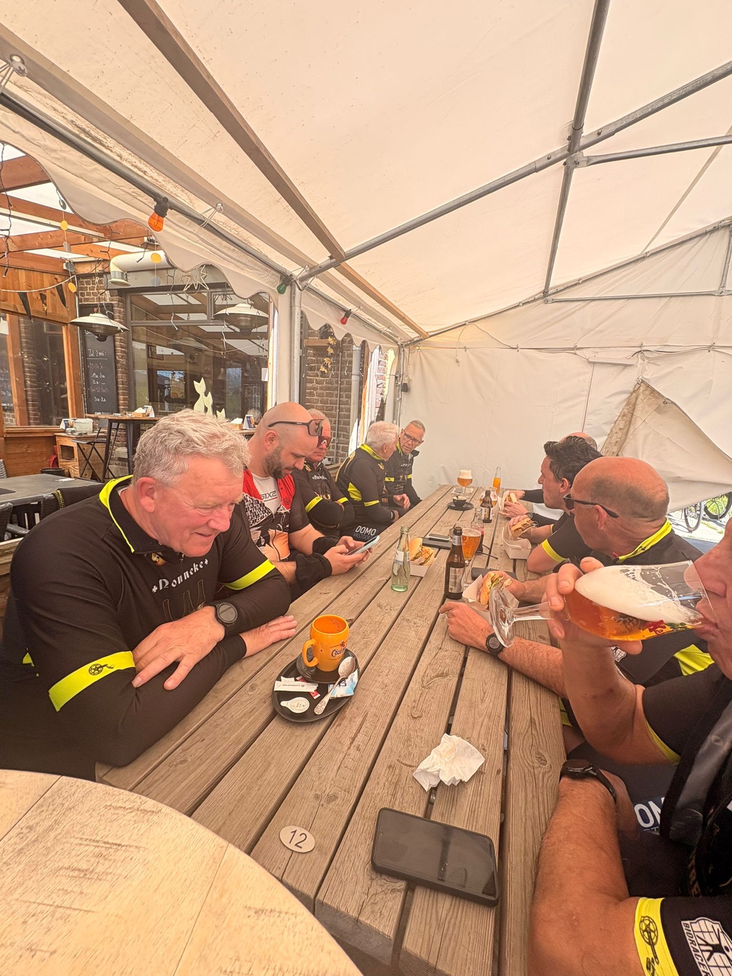 Het parcours was mooi en vlak, ideaal om te genieten. Al zorgden de werken onderweg even voor wat oponthoud en een platte band bij Joris. Maar ook dat was snel gefikst, want ja… het was niet zomaar een rit, het was ook de tweede traktatierit van het seizoen 🍔