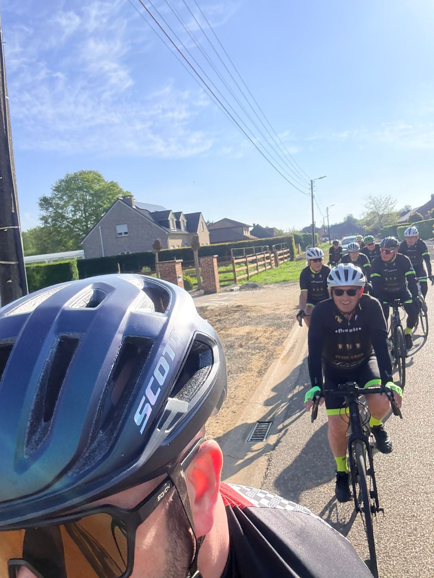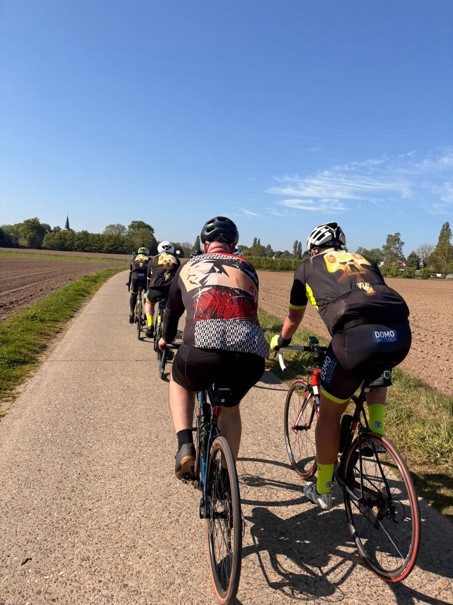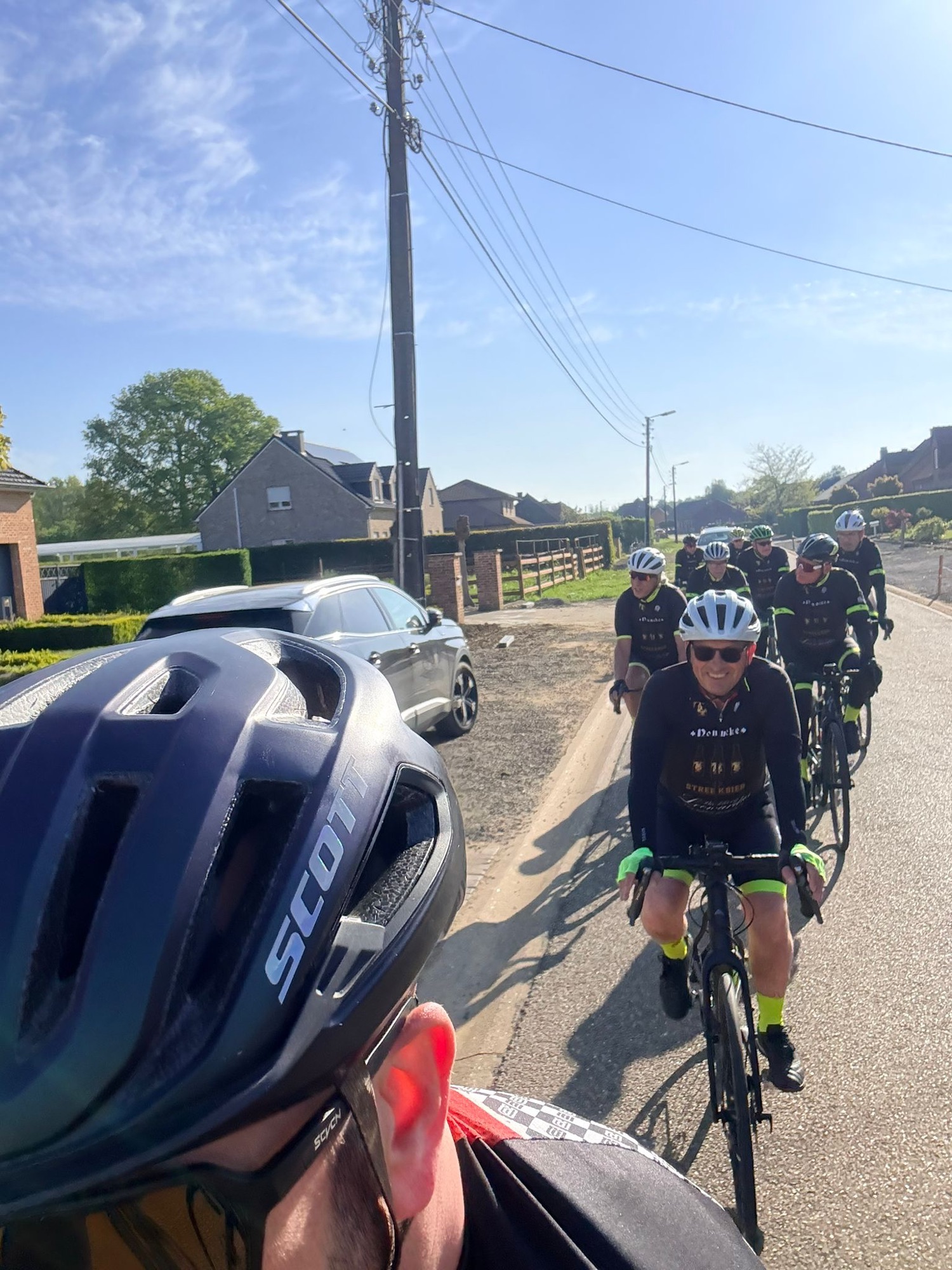 Het parcours was mooi en vlak, ideaal om te genieten. Al zorgden de werken onderweg even voor wat oponthoud en een platte band bij Joris. Maar ook dat was snel gefikst, want ja… het was niet zomaar een rit, het was ook de tweede traktatierit van het seizoen 🍔