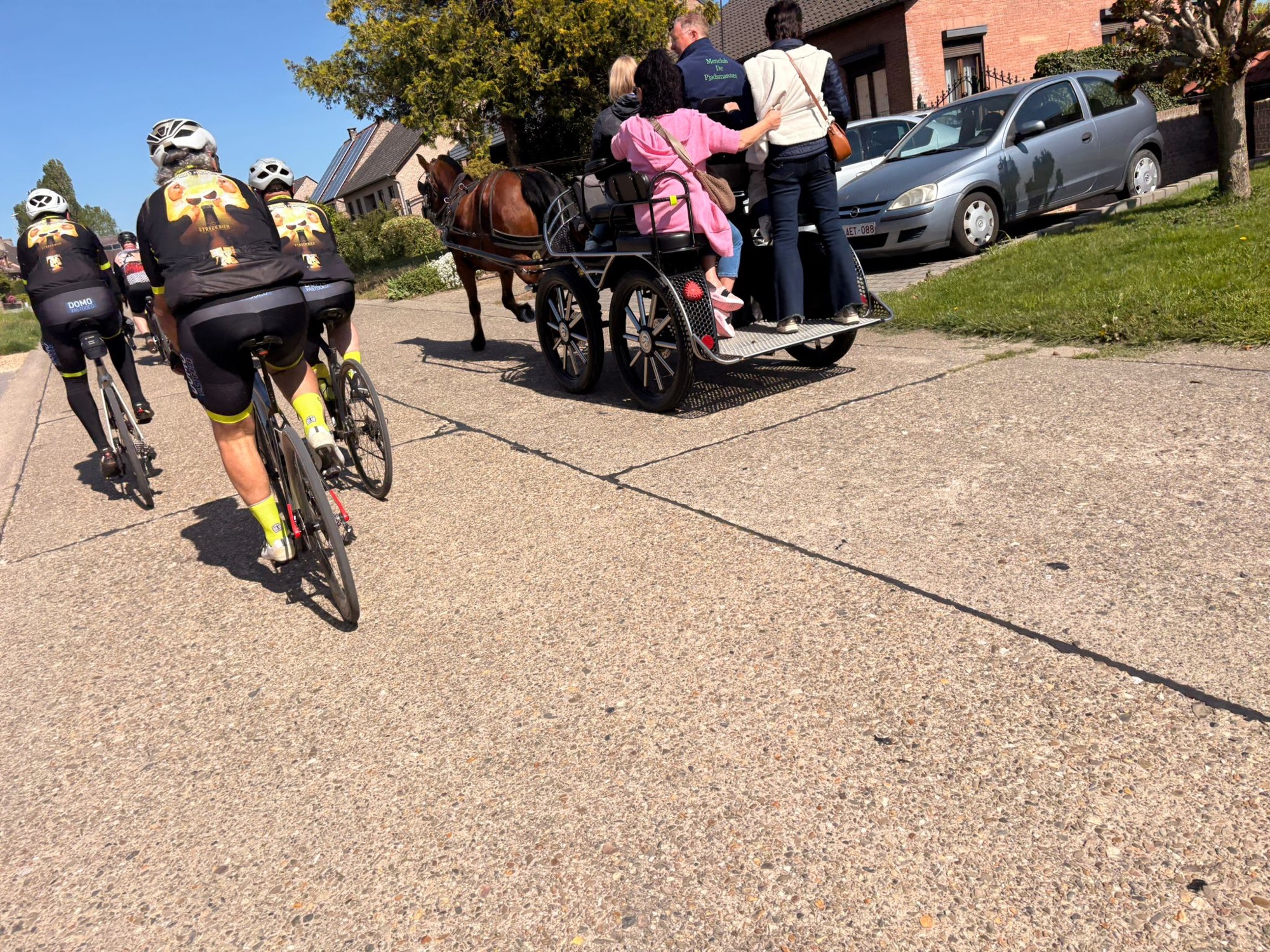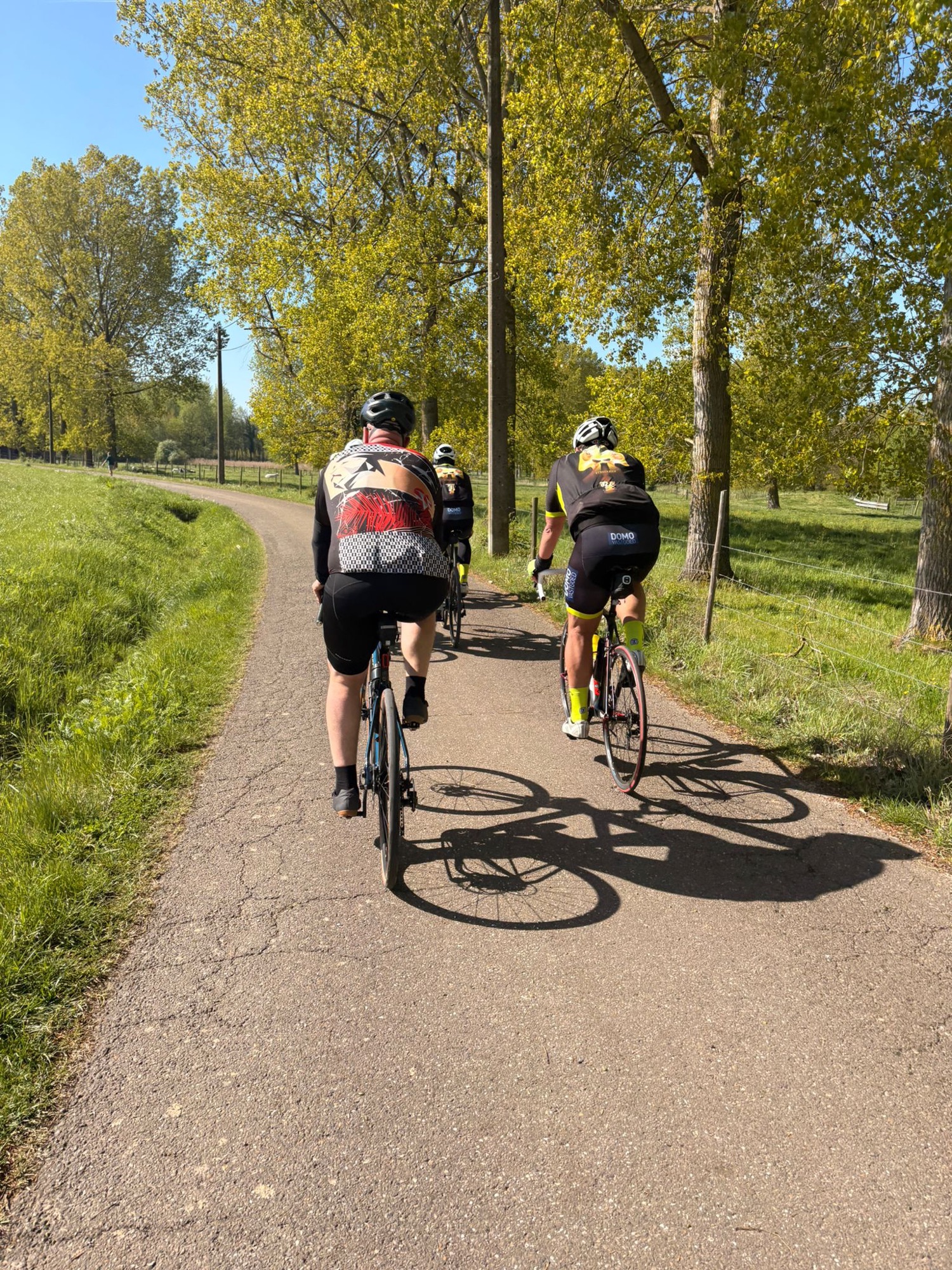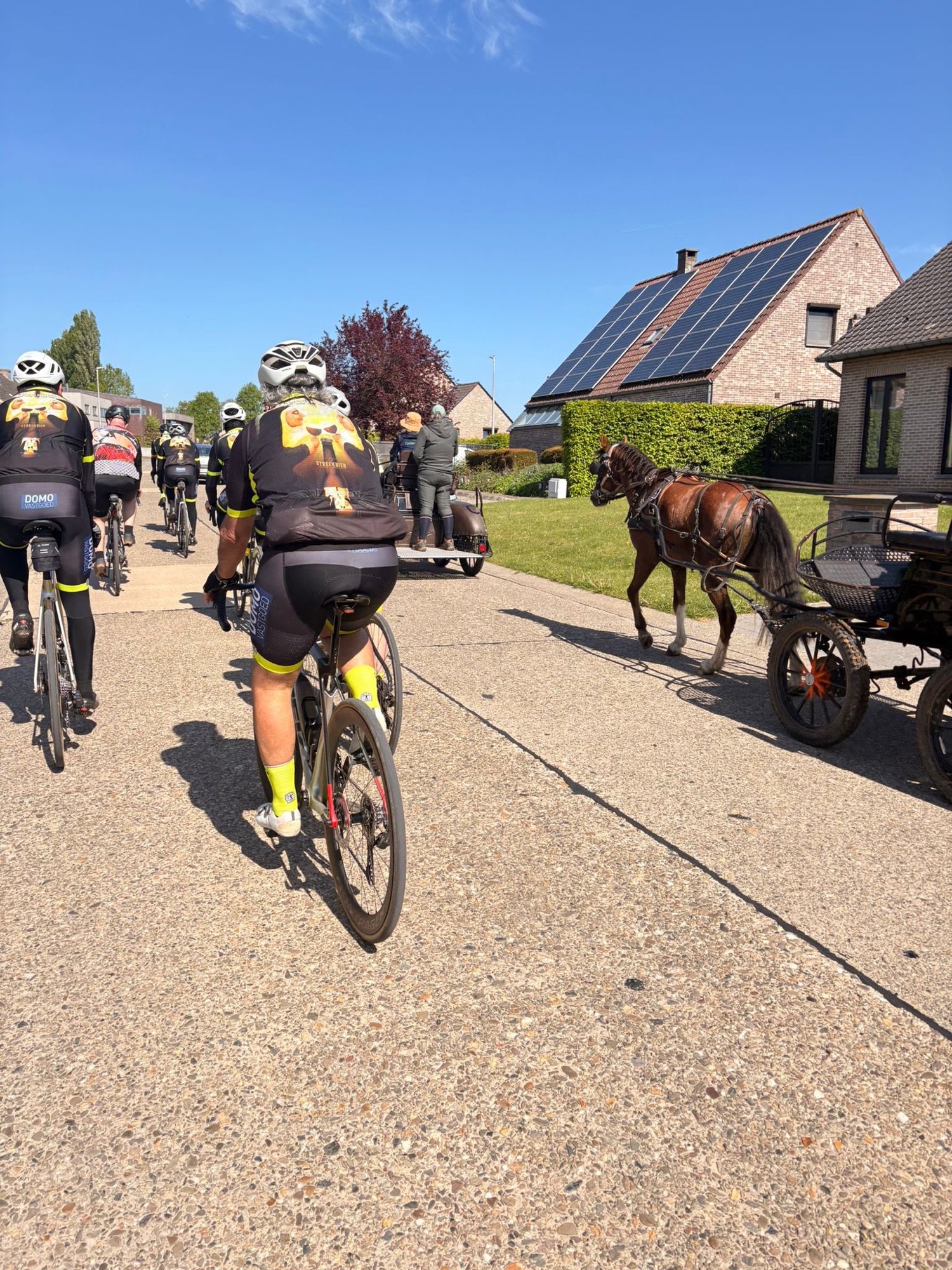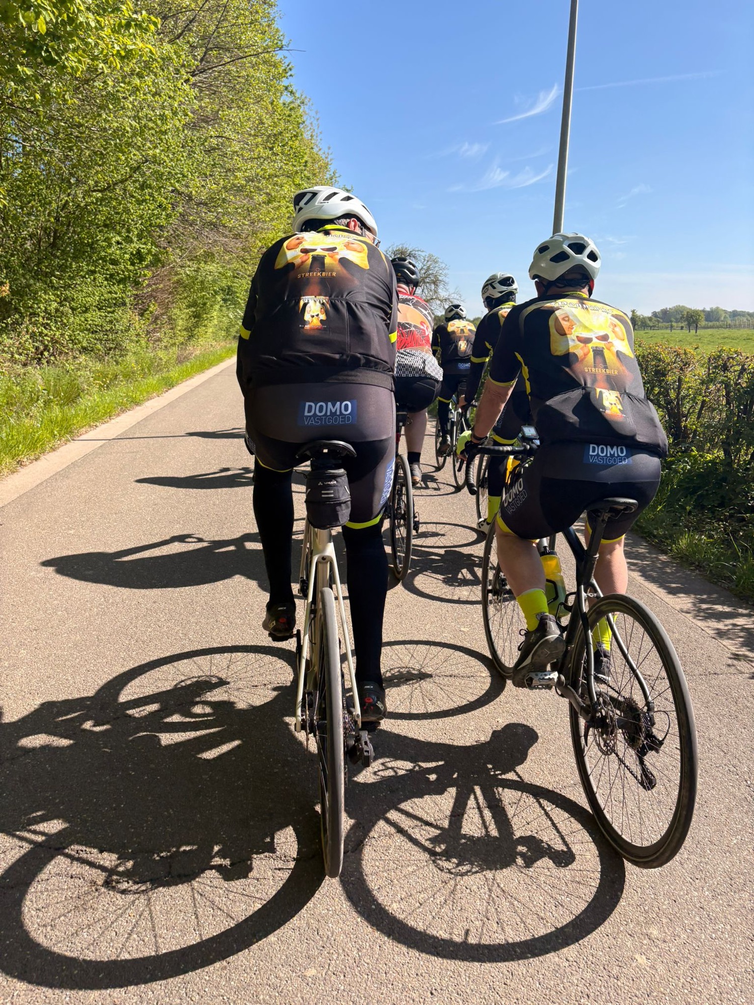 Het parcours was mooi en vlak, ideaal om te genieten. Al zorgden de werken onderweg even voor wat oponthoud en een platte band bij Joris. Maar ook dat was snel gefikst, want ja… het was niet zomaar een rit, het was ook de tweede traktatierit van het seizoen 🍔